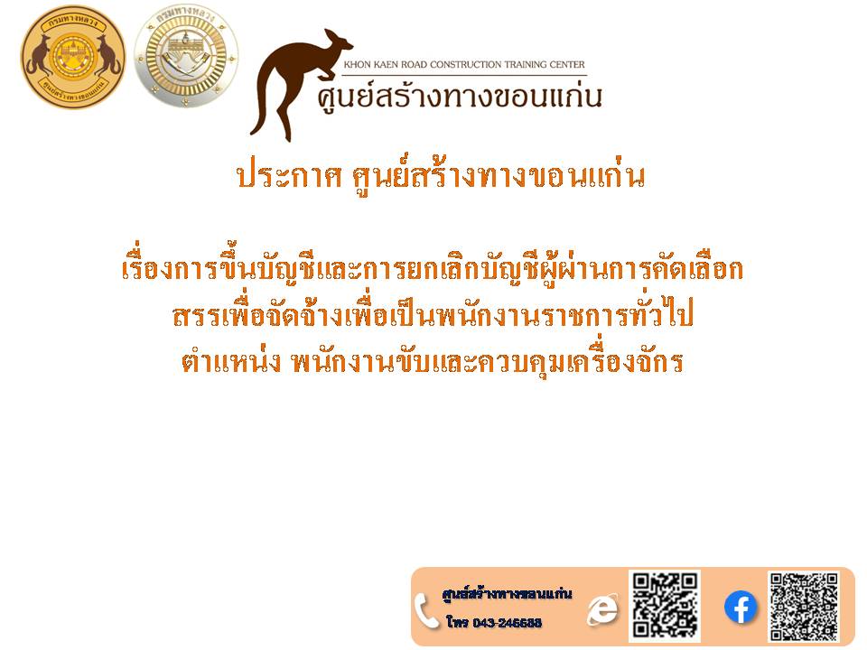 ประกาศศูนย์สร้างทางขอนแก่น วันที่ ๑๗ มิถุนายน ๒๕๖๗ เรื่อง การขึ้นบัญชีและการยกเลิกบัญชีผู้ผ่านการเลือกสรรเพื่อจัดจ้างเป็นพนักงานราชการทั่วไป ในตำแหน่งพนักงานขับและควบคุมเครื่องจักร
