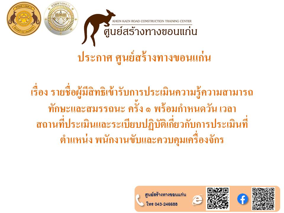 ประกาศศูนย์สร้างทางขอนแก่น ลงวันที่ ๒๖ พฤศจิกายน ๒๕๖๗ เรื่อง รายชื่อผู้มีสิทธิเข้ารับการประเมินสมรรถนะ กำหนดวัน เวลา สถานที่ ในการประเมินสมรรถนะ ครั้งที่ ๑